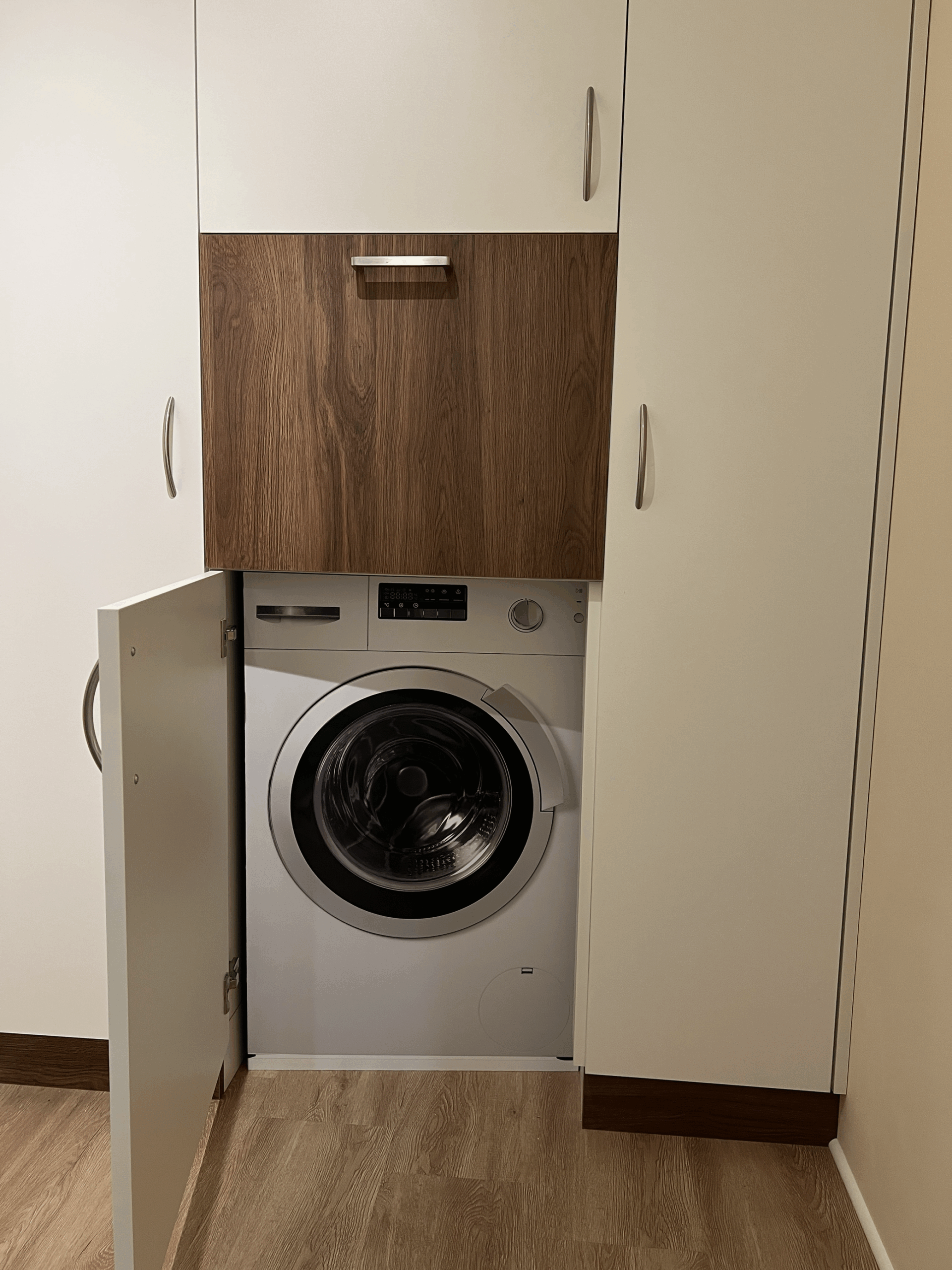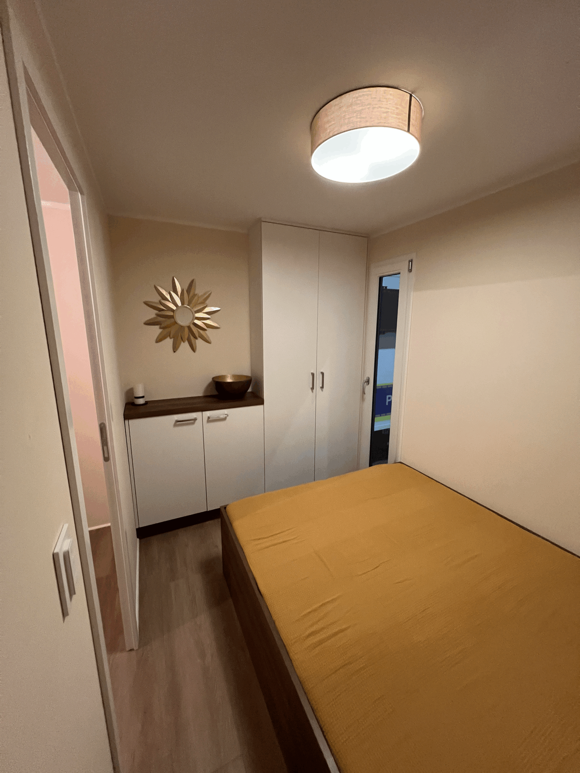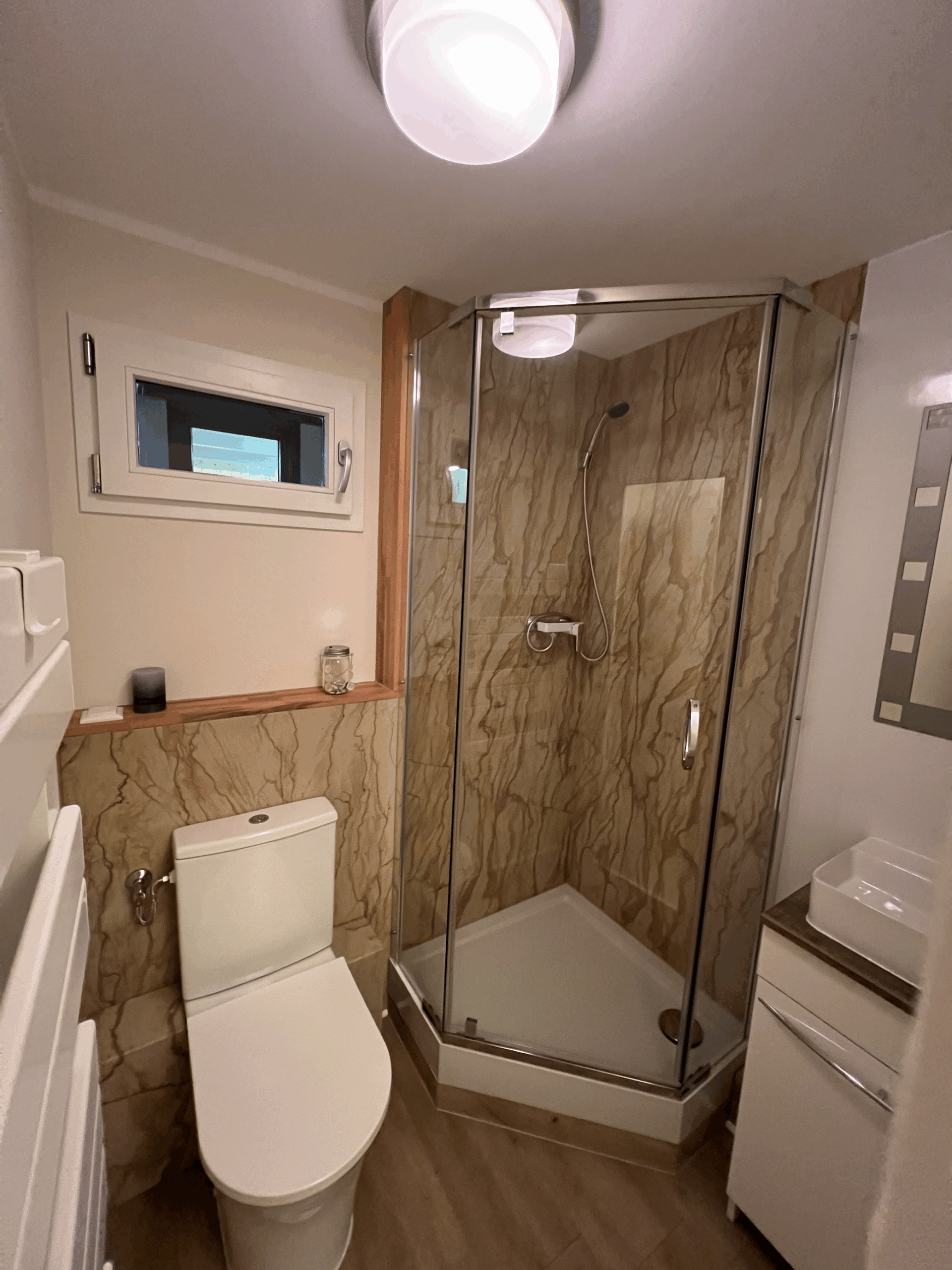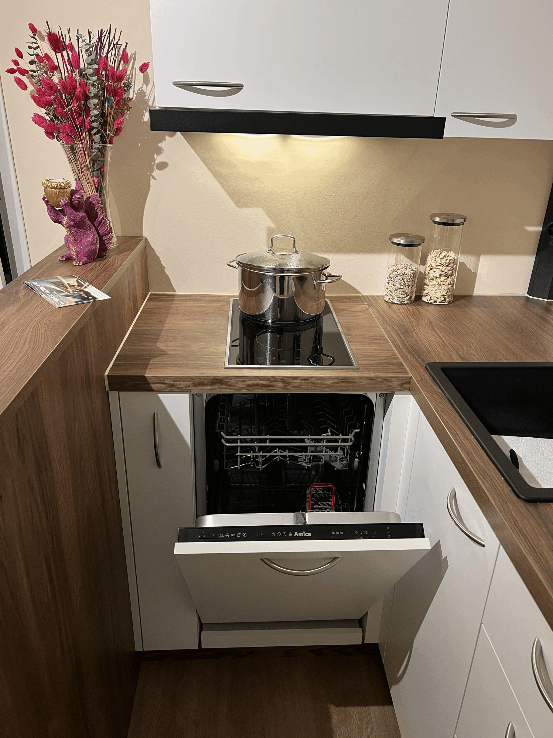 Das Flexmobil Home verfügt über eine hochwertige Innenausstattung mit maßgefertigten Einbauschränken sowie einer komplett ausgestatteten Küche mit Ceranfeld, Geschirrspüler, Kühlschrank, Weinkühler und Dunstabzugshaube. Das moderne Bad bietet eine Dusche und eine Toilette. Für warmes Wasser sorgt ein 30-Liter-Boiler, während eine 2000-Watt-Solaranlage und eine effiziente Wärmepumpe zusätzlichen Komfort und Energieunabhängigkeit schaffen. Ein gemütliches Bett (1,40 × 2,00 m) ist bereits integriert, und ein vorbereiteter Waschmaschinenanschluss steht ebenfalls zur Verfügung. Außen gehören eine Außensteckdose sowie ein frostsicherer Außenwasserhahn zur Grundausstattung und vieles mehr.