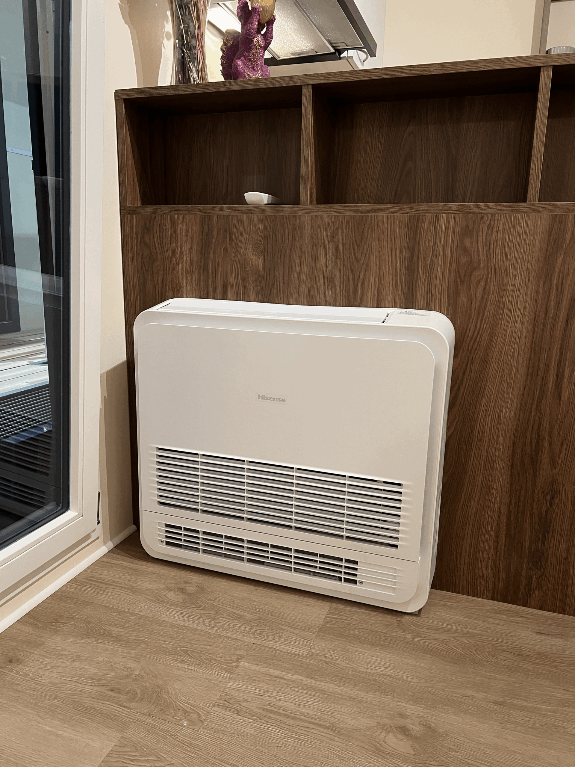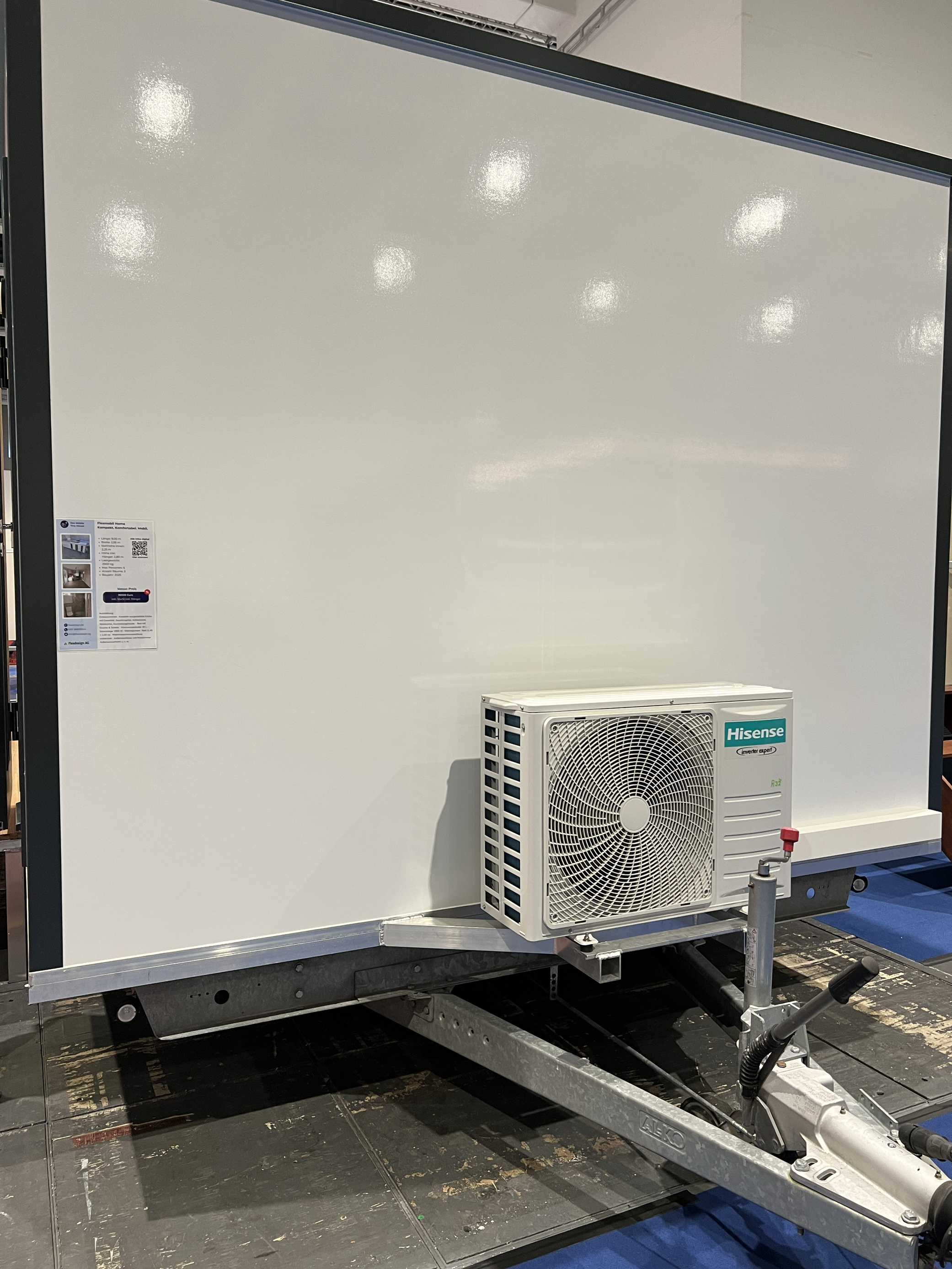 Für die Klima- und Heiztechnik sorgt eine Heisens R-32 Wärmepumpe. Sie arbeitet besonders effizient, nutzt ein umweltfreundlicheres Kältemittel und bietet eine starke Luftumwälzung entsprechend den technischen Herstellerangaben. Dadurch wird das Flexmobil Home ganzjährig angenehm temperiert sowohl im Sommer als auch im Winter